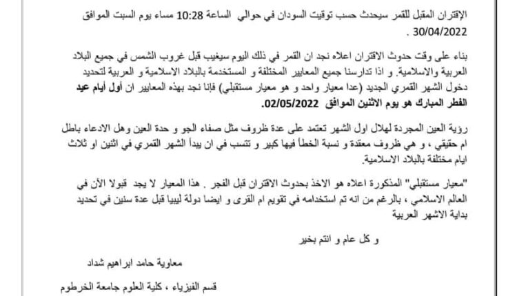 أعلنت الجمعية السودانية لعلوم الفلك والفضاء ان أول أيام عيد الفطر المبارك هو يوم الاثنين الموافق 2022/05/02