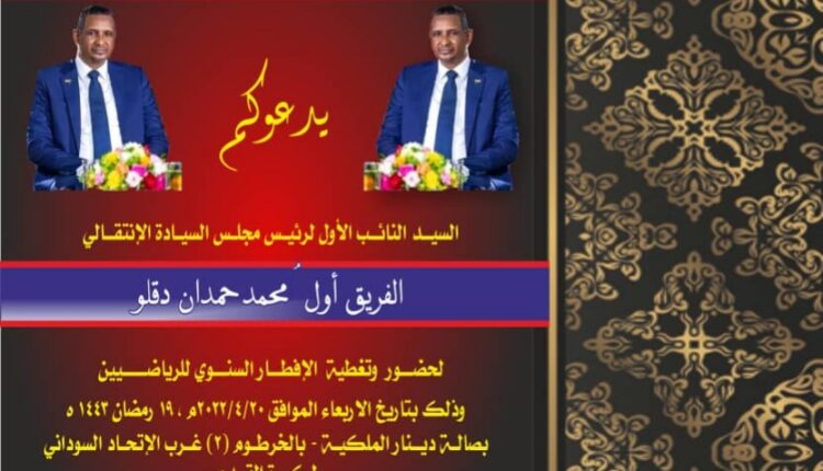 قدم النائب الاول لرئيس مجلس السيادة، الفريق اول محمد حمدان دقلو (حميدتي) رقاع الدعوة لعدد كبير من الرياضيين على مائدة الافطار السنوي بصالة دينار الملكية بالخرطوم، غرب مباني الاتحاد السوداني لكرة القدم، وذلك يوم الاربعاء 20 ابريل الموافق 19 رمضان، هذا وقد شملت الدعوة لفيف من الرياضيين على رأسهم قادة الرياضة في الوزارتين الاتحادية والولائية واللجنة الاولمبية والاتحاد العام والمحلي والاندية المختلفة وقطاع الشباب والناشئين والاعلاميين والصحفيين ورموز الحركة الرياضية والحكام والمدربين.. يحتوي برنامج الافطار على فقرات مختلفة وستكون الفقرة الرئيسية، مخاطبة السيد النائب الاول لرئيس مجلس السيادة الذي سيزف العديد من البشريات للوسط الرياضي.