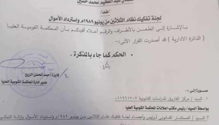 أصدرت المحكمة القومية العليا قرارا ببطلان القرار رقم (2020/13) الصادر من لجنة إزالة التمكين باعفاء وانهاء تكليف مدراء بنوك، وبطلان كل الإجراءات المترتبة على القرار سالف الذكر.