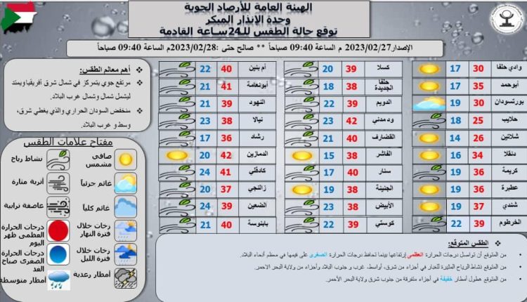 توقعت وحدة الإنذار المبكر بالهيئة العامة للأرصاد الجوية، في السودان، أن تواصل درجات الحرارة العظمى إرتفاعها بينما تحافظ درجات الحرارة الصغرى على قيمها في معظم أنحاء البلاد .