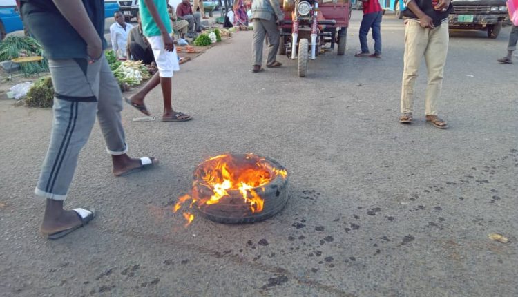 أشعل متظاهرون اطارات السيارات وسط السوق المركزي في الخرطوم جنوب، الآن بسبب حادثة طعن وقعت في السوق امس الأربعاء.