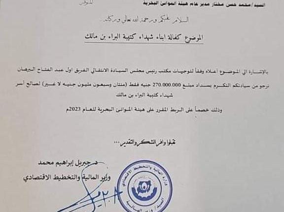 نفت وزارة المالية والتخطيط الاقتصادي ما تم تداوله حول توجيهات وزير المالية جبريل إبراهيم للموانئ البحرية تخصيص 270 مليون جنيه لكفالة أسر شهداء كتيبة البراء بن مالك.