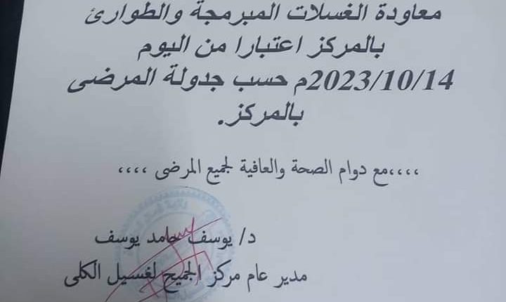 أعلن مركز الجِميح لغسيل الكِلى بمدينة الأبيض عن إستئناف تقديم خدماته لمرضى غسيل الكلى للغسلات المبرمجة والطوارئ، إعتباراً من اليوم السبت ، بعد وصول الإِمداد الدوائِي للمركز.