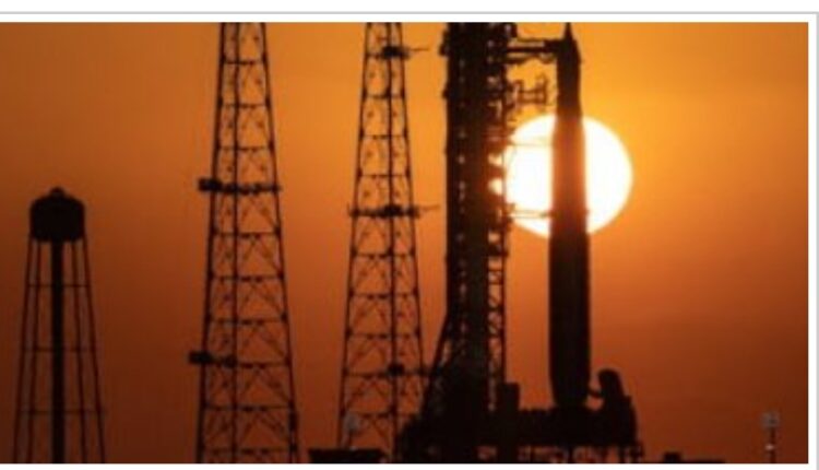 وتُظهر الصورة ، التى تم نشرها على تويتر الصاروخ – الذي تعلوه مركبة أوريون الفضائية الجديدة – على منصة الإطلاق 39B في مركز كينيدي للفضاء في فلوريدا ، مع شروق الشمس في الخلفية.