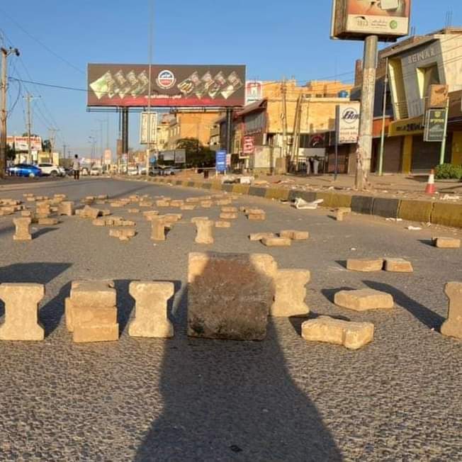 متظاهرون يضعون حواجز أسمنتية في شارع المشتل بالرياض بالخرطوم استجابة لدعوات إغلاق الطرق يومي الثلاثاء والأربعاء
